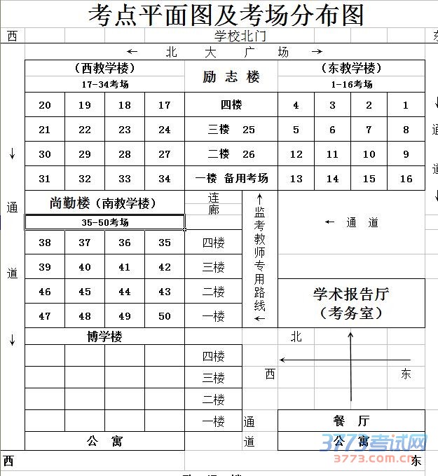 考场分布:励志楼1-34考场,尚勤楼35-50考场。