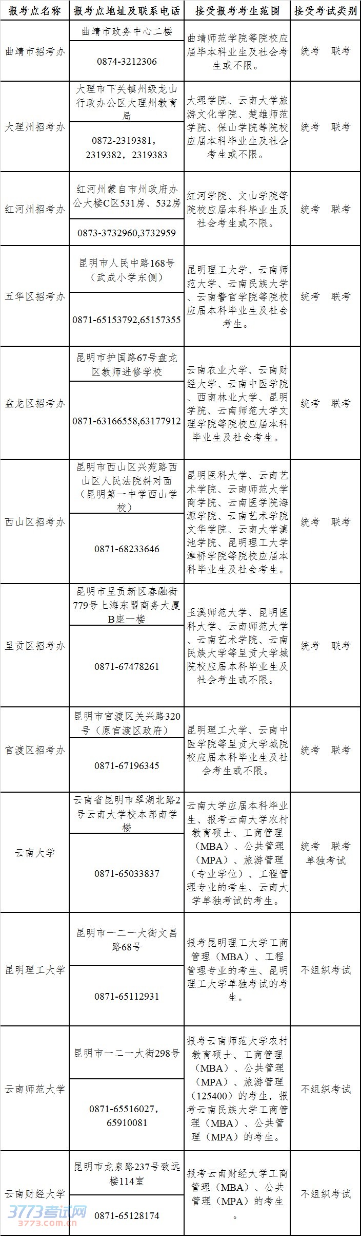 2015年云南考研各报考点接受报考考生范围及考试类别