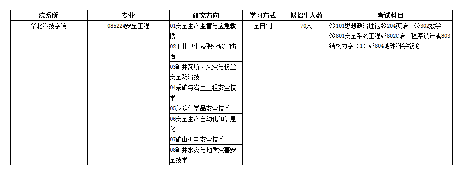 2018华北科技学院安全工程研究生招生专业目录及科目