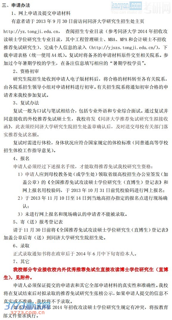 2014同济大学申请推荐免试研究生(含直