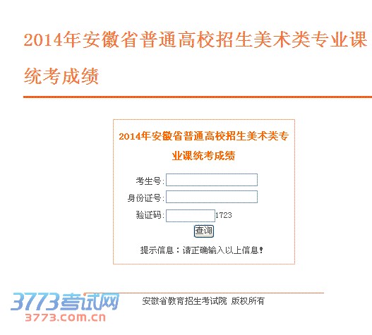 2014安徽美术联考成绩查询入口 2014年安徽省普通高校招生美术类专业课统考成绩2014年安徽省普通高校招生美术类专业课统考成绩考生号:身份证号:验证码:1723提示信息:请正确输入以上信息!安徽省教育招生考试院 版权所有