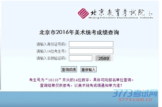 北京市2016年美术统考成绩查询 请输入身份证号码: 请输入14位考生号: 请输入右侧验证码: 考生号为“16110”开头的14位数字,具体可向报名单位查询。查询结果仅供参考,以美术统考成绩通知单为准!