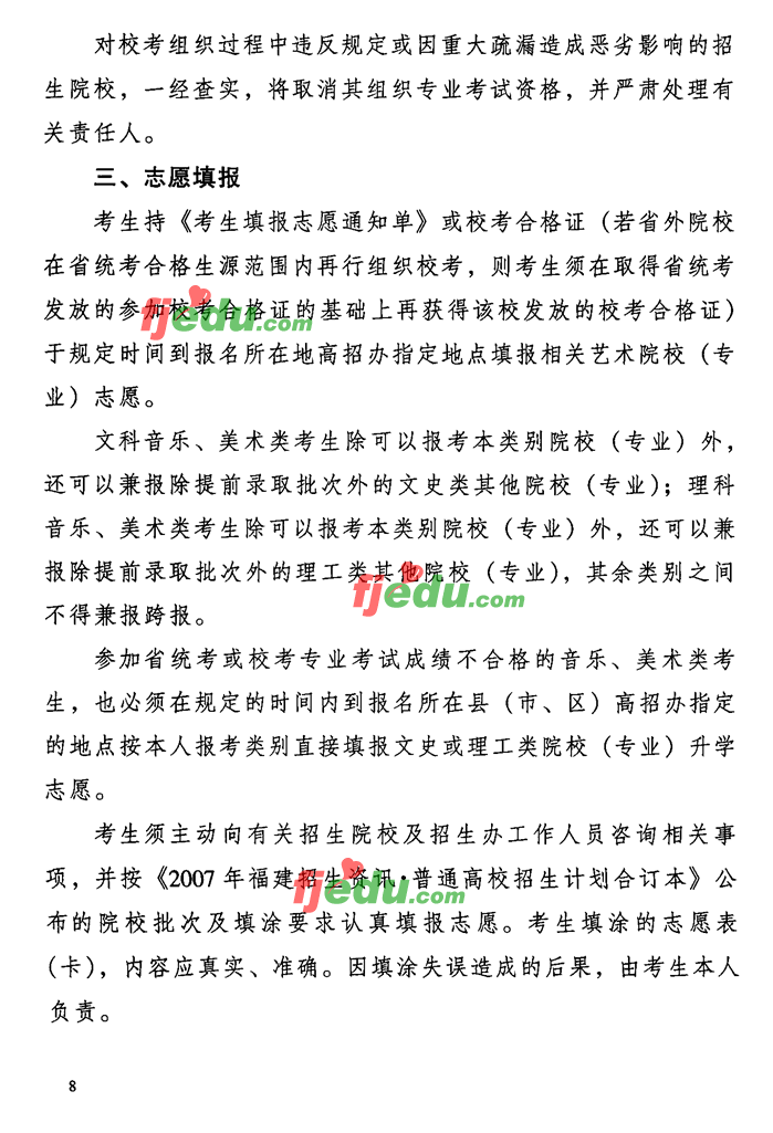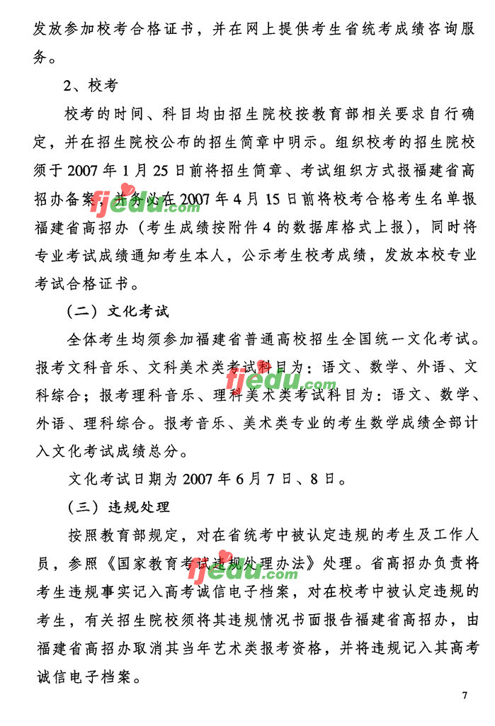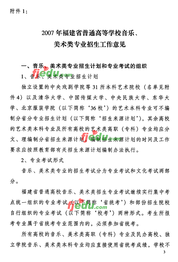 2007年福建省普通高等学校美术音乐类专业招生工作意见招生简章