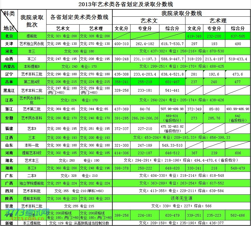 中国美术学院2013年艺术类专业合格分数