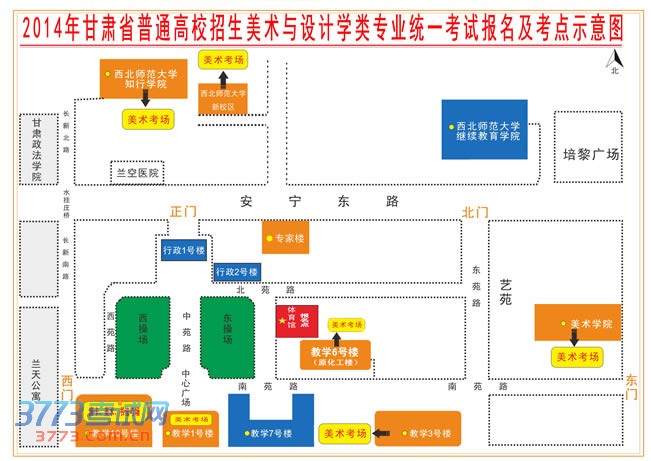请各位考生报名后,提前了解考场地点。知行学院考点考生请乘车至水挂庄桥下车,北行约400米即到。西北师范大学新校区考点考生请乘车至铝厂家属区下车,北行约400米即到。考务组在报名点设有各考点教学楼分布方位示意简图,请认真查看,参见下图。