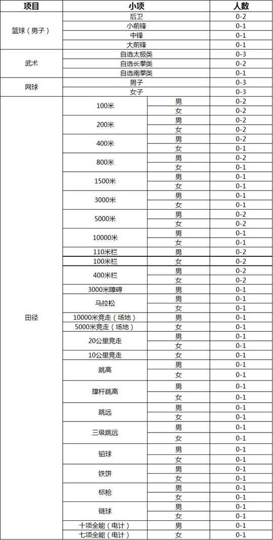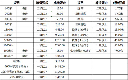 注:实际录取人数将根据生源情况进行适当调整,择优录取,宁缺毋滥。 附件二:报考田径项目运动等级及成绩要求 男子: