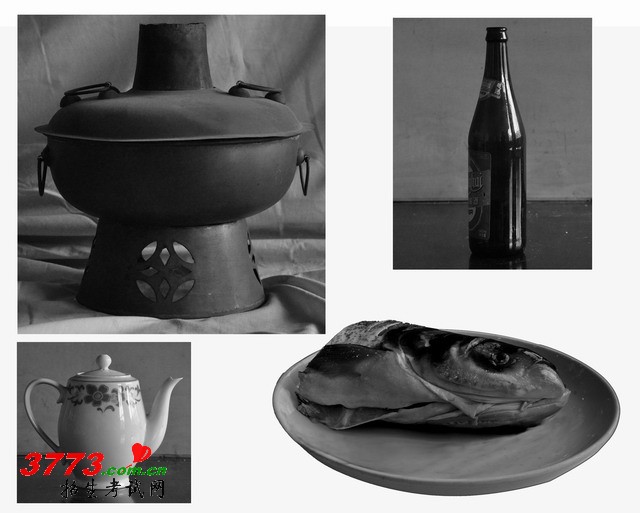 三、模拟写生内容:一个火锅,一个茶壶,一个啤酒瓶,一个鱼头,一个瓷盘。(图片小样见附图4)