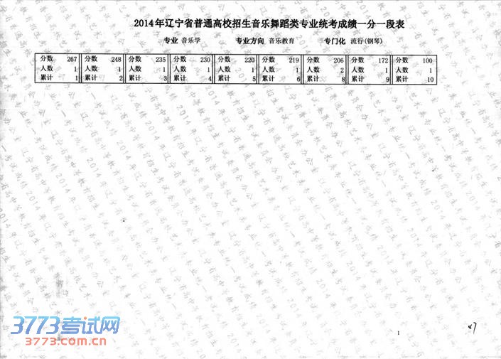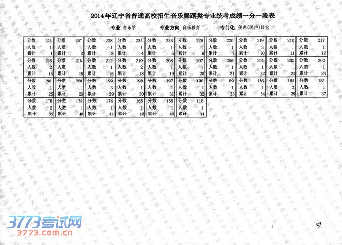 2014辽宁音乐舞蹈统考音乐学专业成绩一分一段表