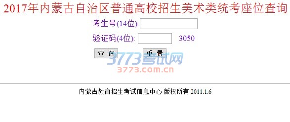2017年内蒙古自治区普通高校招生美术类统考座位查询考生号(14位):验证码(4位): 3050 内蒙古呼和浩特 包头 乌海 赤峰 通辽 鄂尔多斯 呼伦贝尔 巴彦淖尔 乌兰察布 兴安 锡林郭勒 阿拉善
