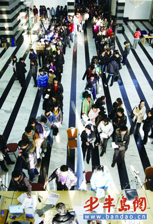 10日是青岛2010年艺考报名的最后一天,八大关宾馆小礼堂报名点只有鲁迅美院一所院校现场接受考生报名,下午4时左右,离报名结束仅有1个小时,可等待报名的长龙已经变成了两条,大厅里已经有了二三百人。
