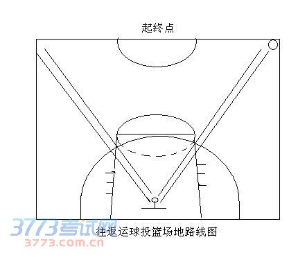 以篮圈垂直投影中心为圆心,以该点至罚球线的距离为半径,划一圆弧。开始时,考生在弧线处作跳投,开始计时:投篮后自己抢篮板球,再运至弧线外再跳投,连续做一分钟(女生投篮可作原地投篮,也可以跳投)。每人做一次,按成绩查所得分。