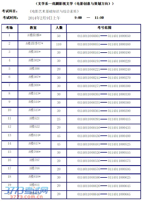 北京电影学院2014年文学系电影剧作方向初试考场安排