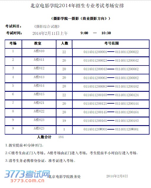 北京电影学院2014年摄影系电影制作A方向初试考场安排