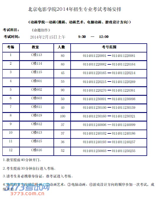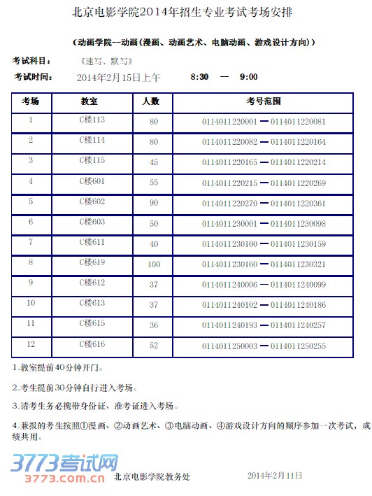 2014北京电影学院漫画动画艺术电脑动画游戏设计考场安排
