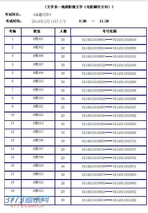 北京电影学院管理系2014年电影电视管理方向考场安排