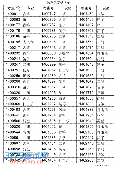 星海音乐学院2014年本科招生考试复试名单(民乐系)