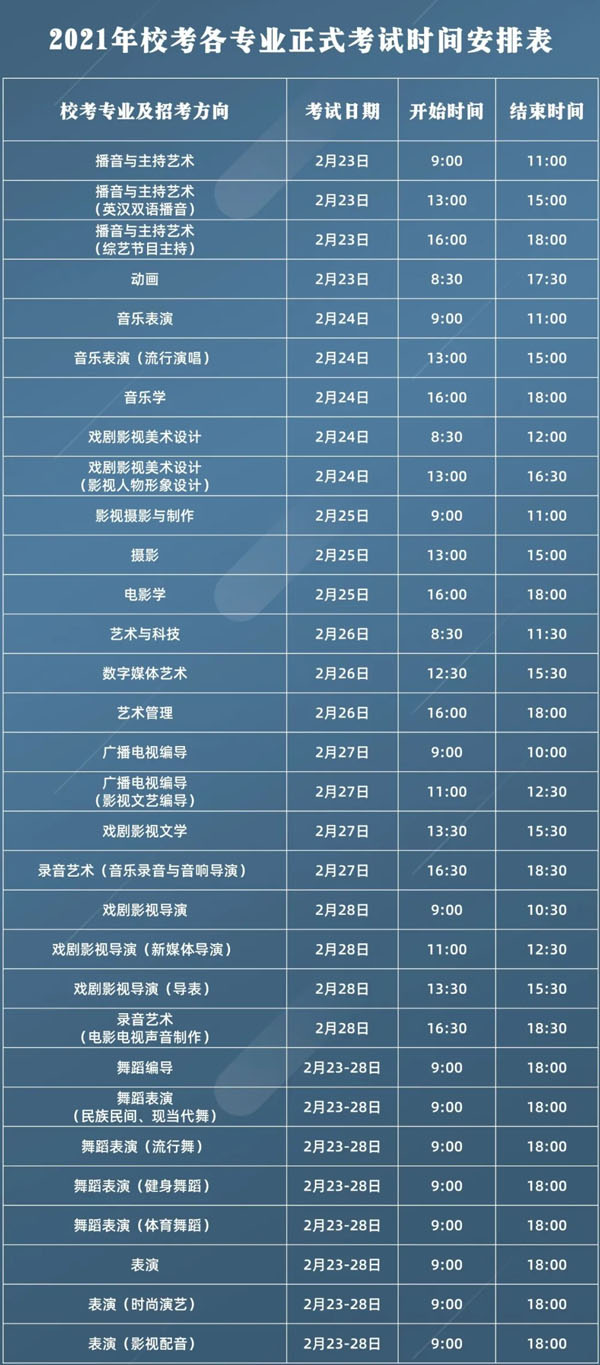 详细安排见《2021年校考各专业正式考试时间安排表》。