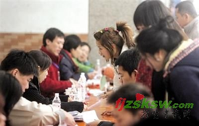 考生在报名处认真询问(图片来源:京华时报 张斌摄)