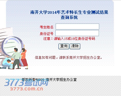 南开大学2014年艺术特长生专业测试成绩查询系统(点击进入)南开大学2014年艺术特长生专业测试结果查询系统 考生姓名 身份证号 注意:请输入15或18位身份证号码