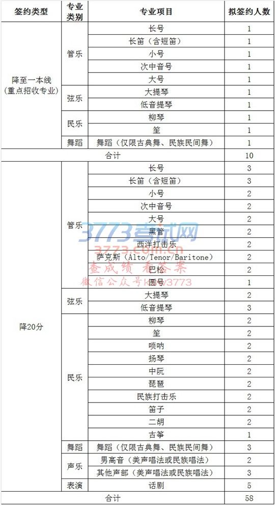 (3)降至一本线录取的优惠资格:符合条件(1)(2),按艺术专业测试成绩从高到低顺次排名,对艺术测试成绩特别优秀的考生给予签约。