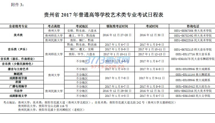 音乐类(声乐) 铜仁、遵义、安顺 2017年1 月8-9 日 2017年1 月10-11 日