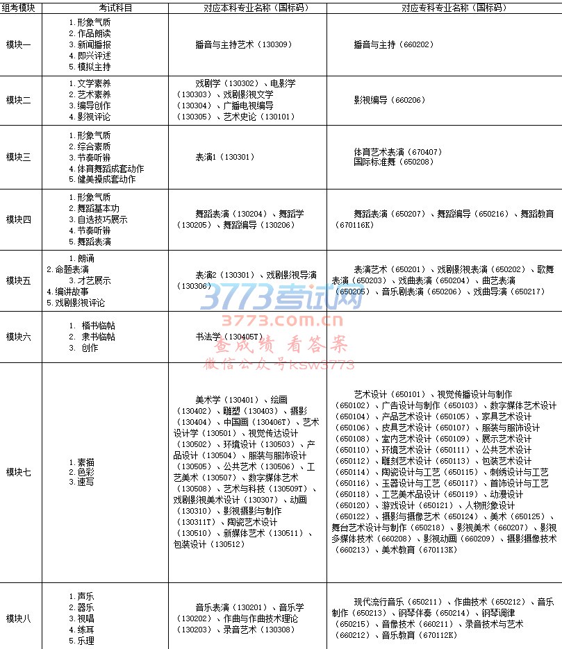 2.专业课全省统一考试(以下简称省统考)报名。按照教育部颁布的艺术基础科类与本科专业对应表,各专业省统考根据其考试科目(相同或相近)共设置8个组考模块,艺术类考生须选择1个与所报专业相对应的统考模块参加专业课省统考。艺术类考生在文化课高考报名的同时,就须完成专业课网上报名手续。考生可以兼报不同模块的考试。