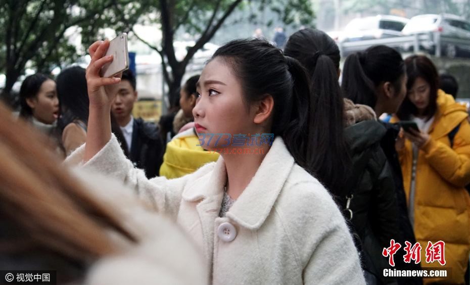12月14日,重庆市,沙坪坝区,重庆大学美视电影学院考点,考生们走进考场。当天,重庆市2017年普高艺术类招生专业考试开考,考场外云集了大量梦想明星生涯的美女帅哥以及前来陪伴的亲朋好友。图片来源:视觉中国