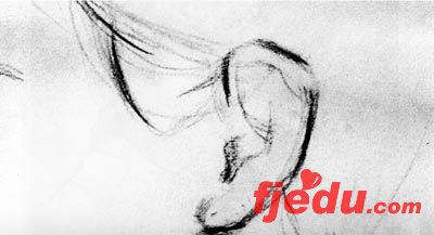 用简单的直线条将耳部的轮廓画出。这个有仰视角度的耳朵要画得偏大一些,同时要注意透视关系对它的影响。 |