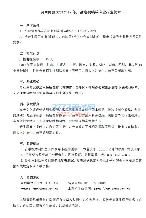 二、招生计划 广播电视编导 45人 2017年面向陕西、甘肃、内蒙古、山西、河南、安徽、湖北、湖南、四川、重庆等10个省份招生,具体分省招生计划以各省(直辖市、自治区)招生办公室公布的为准。 三、考试形式 专业课考试参加生源所在省(直辖市、自治区)招生办公室组织的专业课统(联)考,文化课考试参加普通高等学校招生全国统一考试。