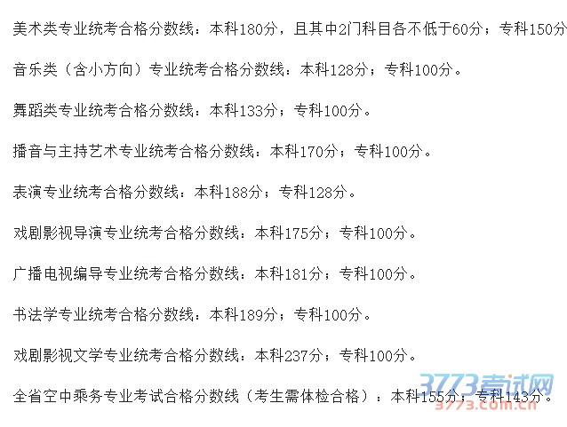 根据教育部《关于做好2015年高校部分特殊类型招生工作的通知》和《贵州省招生委员会关于做好2015年普通高等学校体育、艺术类专业考试招生工作的通知》的要求,结合今年艺术各专业考试的实际情况,省招生委员会划定了我省2015年普通高校招生艺术类各专业考试合格分数线。