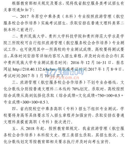 2017贵州旅游管理航空服务校企合作培养专业招生考试通知