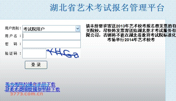 湖北省艺术考试报名管理平台用户类别: 考试院用户 院校用户 招生用户
