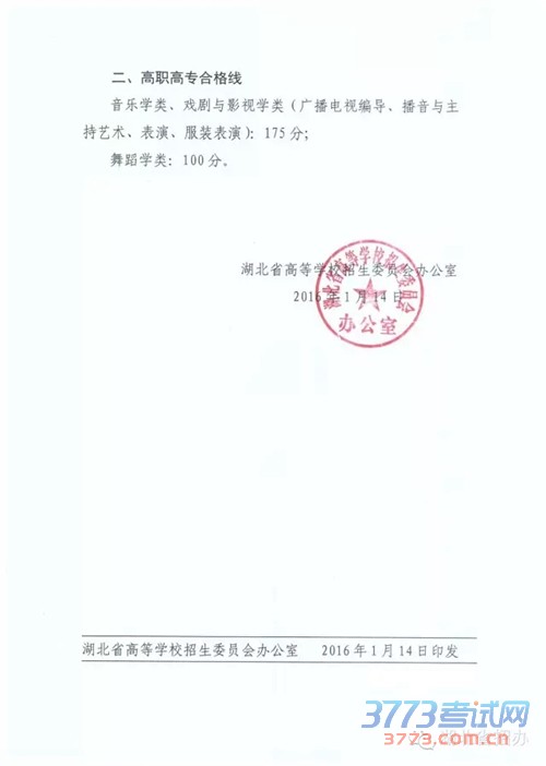 16年湖北省非美术类艺术专业统考合格控制分数线的通知