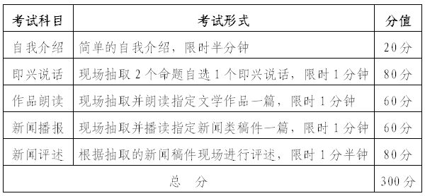 (4)考试:每组考生将分别在2个面试考场参加自我介绍、即兴说话、作品朗读、新闻播报与新闻评述五个科目的面试。即兴说话、作品朗读、新闻播报与新闻评述为现场抽取试题。