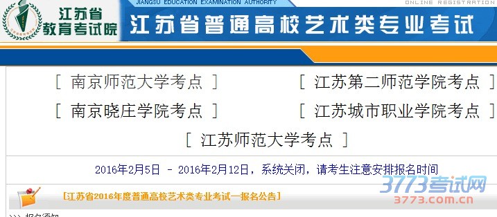 [ 南京师范大学考点 ] [ 江苏第二师范学院考点 ] [ 南京晓庄学院考点 ] [ 江苏城市职业学院考点 ] [ 江苏师范大学考点 ] 2016年2月5日 - 2016年2月12日,系统关闭,请考生注意安排报名时间 [江苏省2016年度普通高校艺术类专业考试--报名公告] >>> 报名须知 2016年江苏艺术校考网上报名入口
