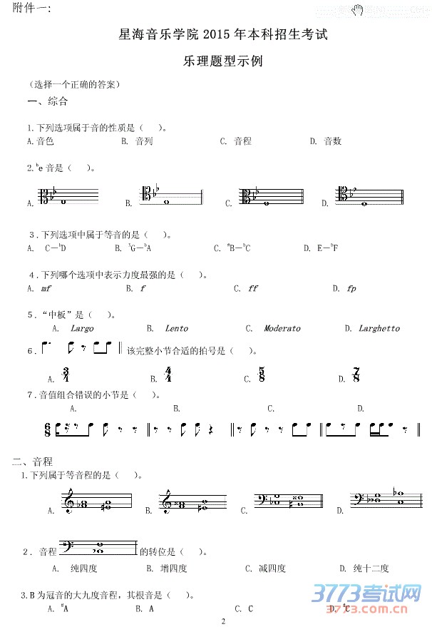 星海音乐学院2015校考乐理和视唱练耳题型示例及机考方式