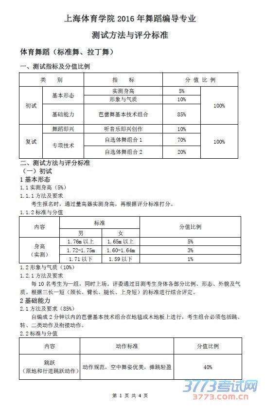 2016上海体育学院舞蹈编导专业测试方法与评分标准