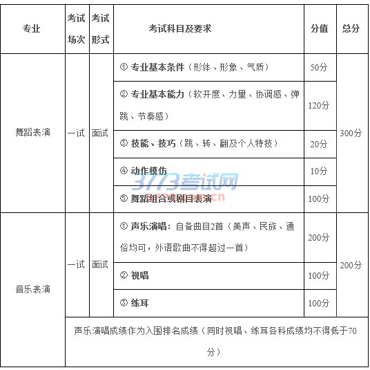 2.符合教育部、卫生部颁发的《普通高等学校招生体检工作指导意见》要求。报考舞蹈表演专业、音乐表演专业的考生,男性身高不得低于1.7米,女性身高不得低于1.6米。