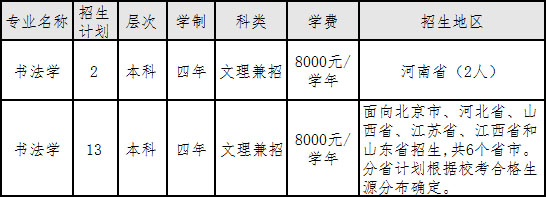 2020年我校书法学专业仅面向北京市、河北省、山西省、江苏省、江西省、山东省、河南省招生。其中河南省作为我校2020年的试点省份,使用省级统考成绩作为考生专业测试成绩,无须参加我校校考;除河南省外的考生均须参加我校校考,以我校校考成绩作为专业测试成绩。