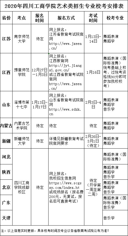 四川工商学院2020年在吉林、江苏、新疆、山东、北京、广东、河北、陕西、江西进行艺术类招生专业校考,其中江西、江苏、山东、北京由各省指定网站网上统一报名,河北、陕西