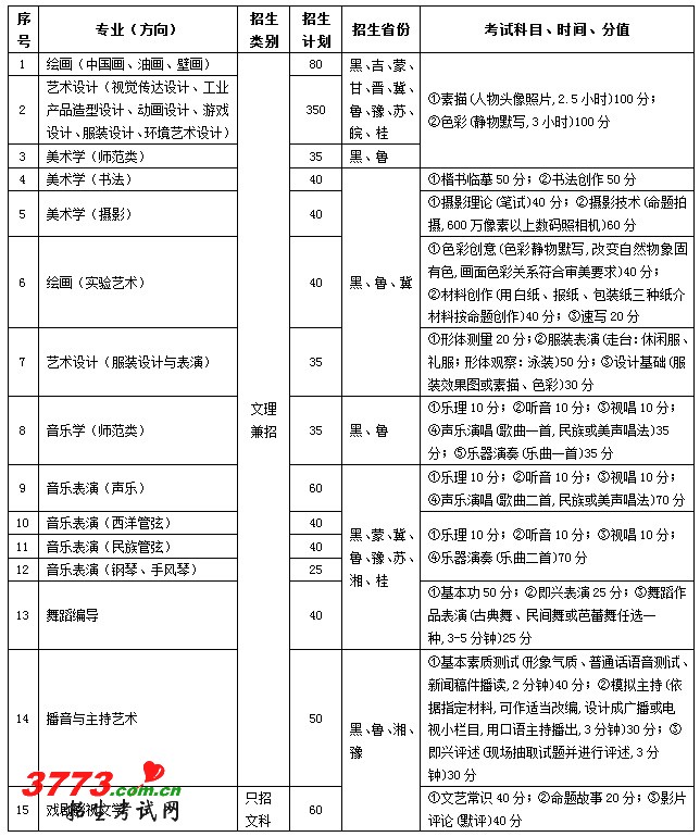 3.考生参加考试所需用具、服装等物品自备,舞蹈编导专业所需音乐伴奏带自备,绘画(实验艺术)专业所需剪刀、胶水自备。