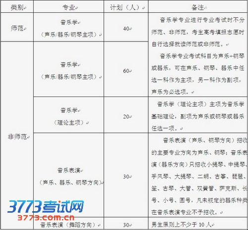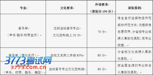 备注:①音乐学(声乐/器乐/钢琴主项)专业各省前三名(计划人数在5人以上),原则上可以降低20分(原始分)录取。