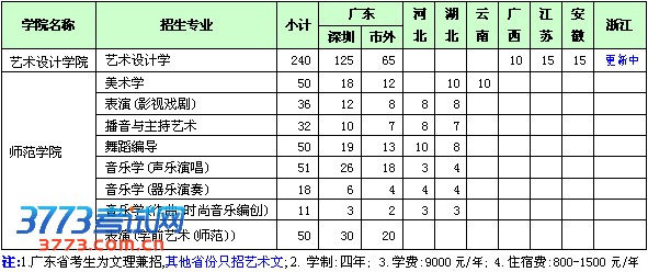 特别说明:艺术设计学院在广东省招生名称为“艺术设计学院”,在外省招生名称为艺术设计学,设艺术设计学(创意策划与设计管理)、产品设计、环境设计、服装设计与工程、视觉传达设计、动画专业。新生进校后按大平台授课,前二个学期不分专业,学习公共课、基础课,第三学期开始,按学生志愿及有关专业要求确定专业。