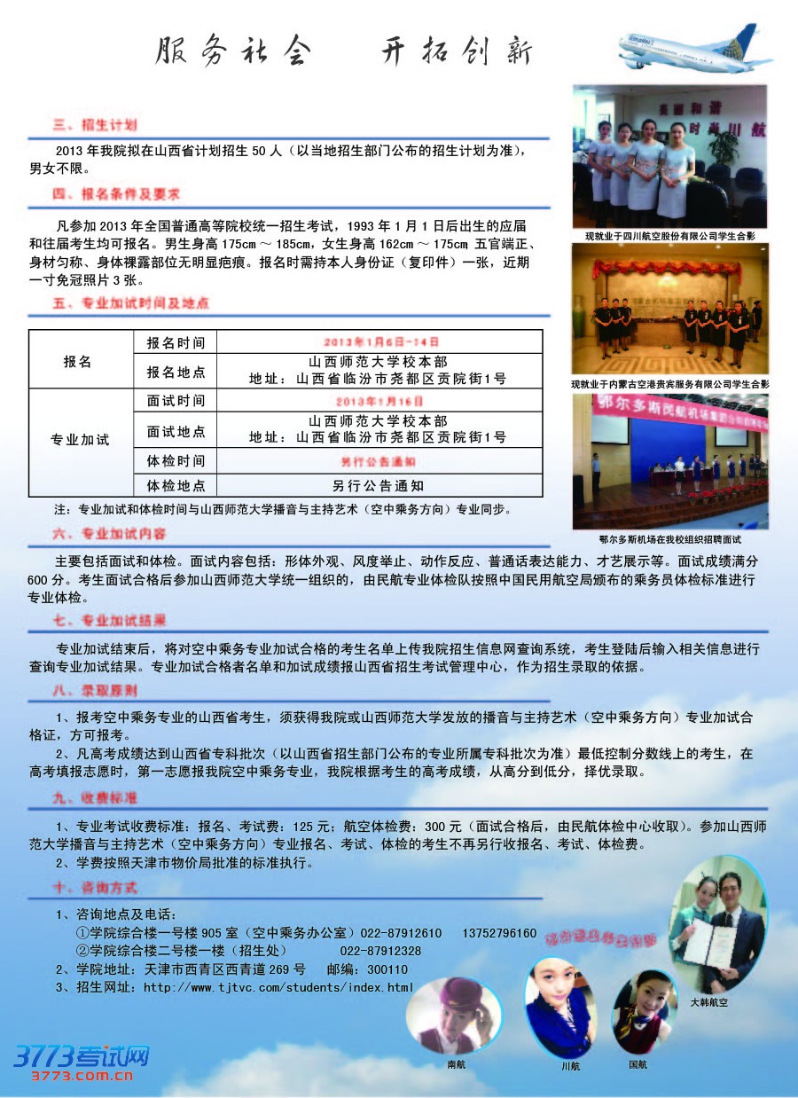 天津交通职业学院2013年空中乘务招生简章(山西)