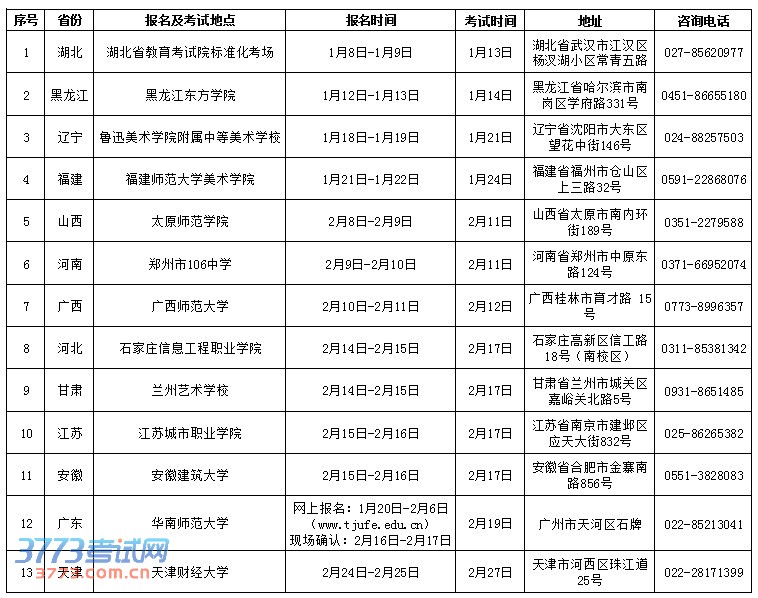 天津财经大学2014年艺术类考点报名考试时间 报考时间及地点: