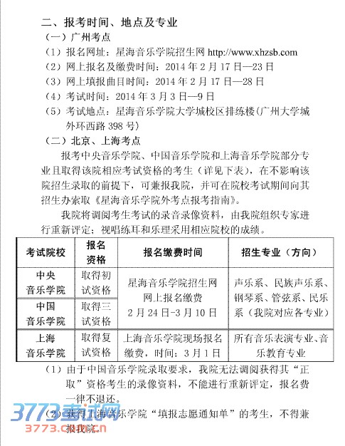 星海音乐学院2014年招生报考时间考点