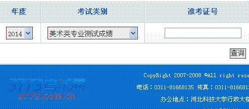 河北科技大学2014年艺术类专业成绩查询:http://zsjyc.depart.hebust.edu.cn/zs/search_kscj.asp