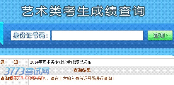 通 知 2014年艺术类专业校考成绩已发布 查询结果 查询提示 您未输入,请在上方输入身份证号码进行查询! 考生姓名 身份证号 准考证号 考生省份 素 描 色 彩 考生总分 专业排名 备注信息 合 格 线