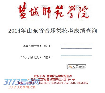盐城师范学院2014年音乐学(师范)、音乐表演在山东省招生并单独组织艺术类专业考试,我校根据山东省《2014年普通高等学校艺术类专业招生办法》有关规定,按计划数1:4发放校考专业合格证书。专业考试合格者可从我校招生网直接打印《盐城师范学院2014年普通高校艺术类专业考试合格证》,同时须参加全国普通高校招生文化考试。成绩查询网址:http://zs.yctc.edu.cn/lqcx/