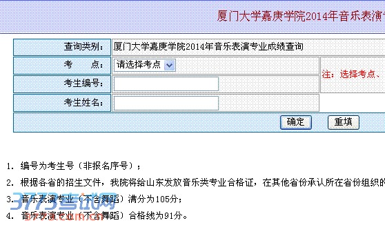招生信息查询系统 厦门大学嘉庚学院2014年音乐表演专业成绩查询 查询类别: 厦门大学嘉庚学院2014年音乐表演专业成绩查询 考 点: 请选择考点 济南 注:选择考点、输入考生编号、姓名查询。 考生编号: 考生姓名: